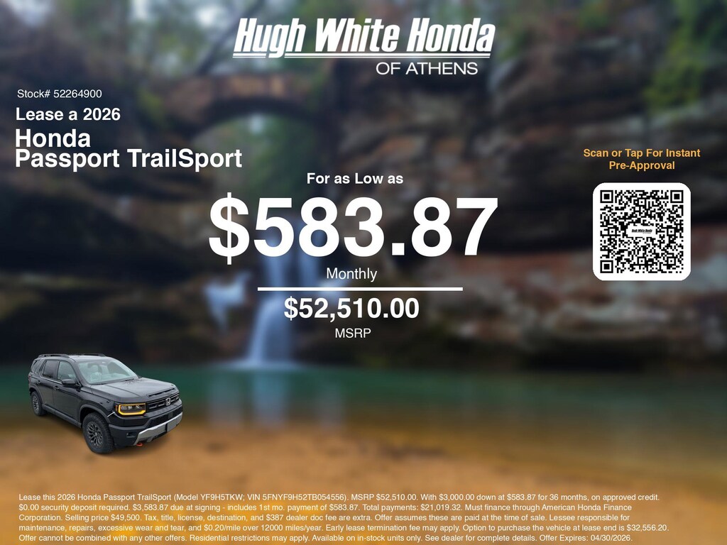 Disclaimer: Lease this 2026 Honda Passport TrailSport (Model YF9H5TKW; VIN 5FNYF9H52TB054556). MSRP $52,510.00. With $3,000.00 down at $583.87 for 36 months, on approved credit. $0.00 security deposit required. $3,583.87 due at signing - includes 1st mo. payment of $583.87. Total payments: $21,019.32. Must finance through American Honda Finance Corporation. Selling price $49,500. Tax, title, license, destination, and $387 dealer doc fee are extra. Offer assumes these are paid at the time of sale. Lessee responsible for maintenance, repairs, excessive wear and tear, and $0.20/mile over 12000 miles/year. Early lease termination fee may apply. Option to purchase the vehicle at lease end is $32,556.20. Offer cannot be combined with any other offers. Residential restrictions may apply. Available on in-stock units only. See dealer for complete details. Offer Expires: 04/30/2026.