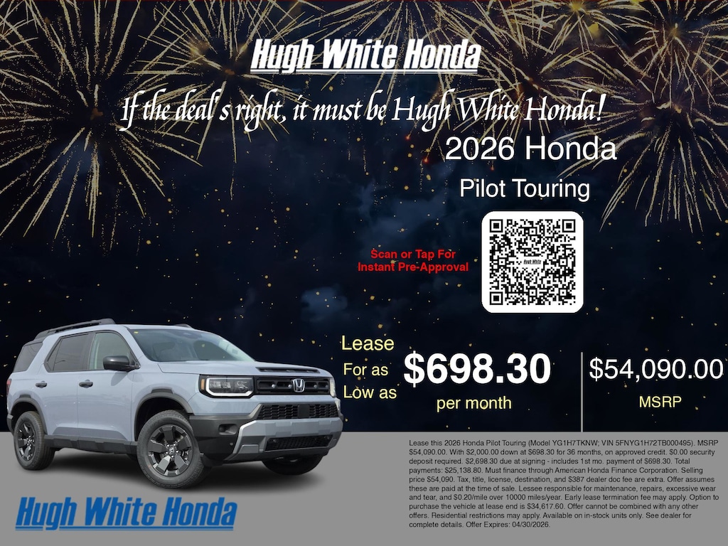 If the deal's right, it must be Hugh White! Stop in today and see why thousands of customers have trusted us with their new vehicles over the years! 2026 Honda Pilot Modern Steel Metallic