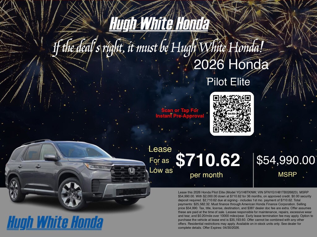 If the deal's right, it must be Hugh White! Stop in today and see why thousands of customers have trusted us with their new vehicles over the years! 2026 Honda Pilot Modern Steel Metallic