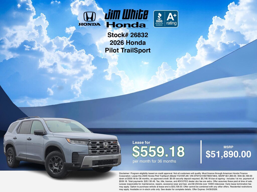 These offers leverage the benefits of Honda Financial Services, along with current Honda incentives, Honda Pilot TrailSport specials, and tax incentives available on electric vehicles. Additionally, we offer 3 other Pilot TrailSport options for the best selection in Maumee. Call or drive in for competitive Honda lease offers you can drive home today, like this stunning 2026 Honda Pilot with lease options near Maumee! This Pilot is also available for sale near Toledo, Perrysburg, and Waterville. These Honda lease specials end 4/30/2026 Disclaimer: Disclaimer: Program eligibility based on credit approval. Not all customers will qualify. Must finance through American Honda Finance Corporation. Lease this 2026 Honda Pilot TrailSport (Model YG1H6TJW; VIN 5FNYG1H60TB007484). MSRP $51,890.00. With $5,189.00 down at $559.18 for 36 months, on approved credit. $0.00 security deposit required. $5,748.18 due at signing - includes 1st mo. payment of $559.18. Total payments: $20,130.48. Tax, title, license, and #DOCFEE dealer doc fee are extra. Offer assumes these paid at time of sale. Lessee responsible for maintenance, repairs, excessive wear and tear, and $0.20/mile over 10000 miles/year. Early lease termination fee may apply. Option to purchase vehicle at lease end is $33,728.50. Offer cannot be combined with any other offers. Residential restrictions may apply. Available on in-stock units only. See dealer for complete details. Offer Expires: 04/30/2026.
