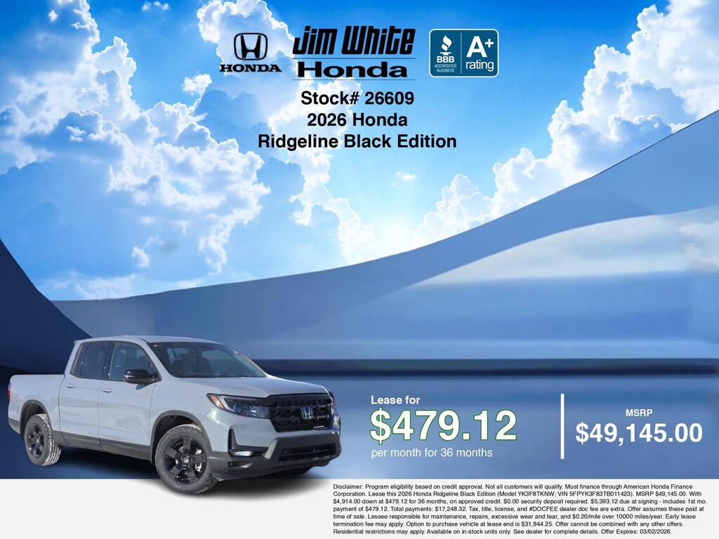 These offers leverage the benefits of Honda Financial Services, along with current Honda incentives, Honda Ridgeline Black Edition specials, and tax incentives available on electric vehicles. Additionally, we offer 8 other Ridgeline Black Edition options for the best selection in Maumee. Call or drive in for competitive Honda lease offers you can drive home today, like this stunning 2026 Honda Ridgeline with lease options near Maumee! This Ridgeline is also available for sale near Toledo, Perrysburg, and Waterville. These Honda lease specials end 3/2/2026 Disclaimer: Disclaimer: Program eligibility based on credit approval. Not all customers will qualify. Must finance through American Honda Finance Corporation. Lease this 2026 Honda Ridgeline Black Edition (Model YK3F8TKNW; VIN 5FPYK3F83TB011423). MSRP $49,145.00. With $4,914.00 down at $479.12 for 36 months, on approved credit. $0.00 security deposit required. $5,393.12 due at signing - includes 1st mo. payment of $479.12. Total payments: $17,248.32. Tax, title, license, and #DOCFEE dealer doc fee are extra. Offer assumes these paid at time of sale. Lessee responsible for maintenance, repairs, excessive wear and tear, and $0.20/mile over 10000 miles/year. Early lease termination fee may apply. Option to purchase vehicle at lease end is $31,944.25. Offer cannot be combined with any other offers. Residential restrictions may apply. Available on in-stock units only. See dealer for complete details. Offer Expires: 03/02/2026.