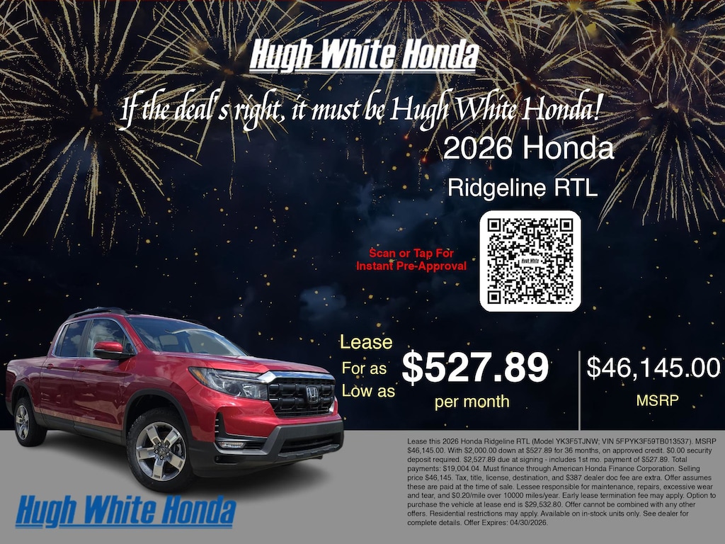 If the deal's right, it must be Hugh White! Stop in today and see why thousands of customers have trusted us with their new vehicles over the years! 2026 Honda Ridgeline Radiant Red Metallic II