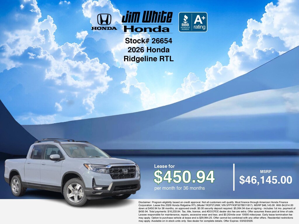 These offers leverage the benefits of Honda Financial Services, along with current Honda incentives, Honda Ridgeline RTL specials, and tax incentives available on electric vehicles. Additionally, we offer 1 other Ridgeline RTL options for the best selection in Maumee. Call or drive in for competitive Honda lease offers you can drive home today, like this stunning 2026 Honda Ridgeline with lease options near Maumee! This Ridgeline is also available for sale near Toledo, Perrysburg, and Waterville. These Honda lease specials end 3/2/2026 Disclaimer: Disclaimer: Program eligibility based on credit approval. Not all customers will qualify. Must finance through American Honda Finance Corporation. Lease this 2026 Honda Ridgeline RTL (Model YK3F5TJNW; VIN 5FPYK3F55TB011817). MSRP $46,145.00. With $4,614.00 down at $450.94 for 36 months, on approved credit. $0.00 security deposit required. $5,064.94 due at signing - includes 1st mo. payment of $450.94. Total payments: $16,233.84. Tax, title, license, and #DOCFEE dealer doc fee are extra. Offer assumes these paid at time of sale. Lessee responsible for maintenance, repairs, excessive wear and tear, and $0.20/mile over 10000 miles/year. Early lease termination fee may apply. Option to purchase vehicle at lease end is $29,994.25. Offer cannot be combined with any other offers. Residential restrictions may apply. Available on in-stock units only. See dealer for complete details. Offer Expires: 03/02/2026.