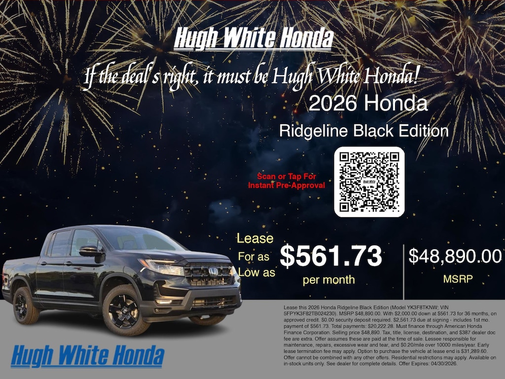 If the deal's right, it must be Hugh White! Stop in today and see why thousands of customers have trusted us with their new vehicles over the years! 2026 Honda Ridgeline Crystal Black Pearl