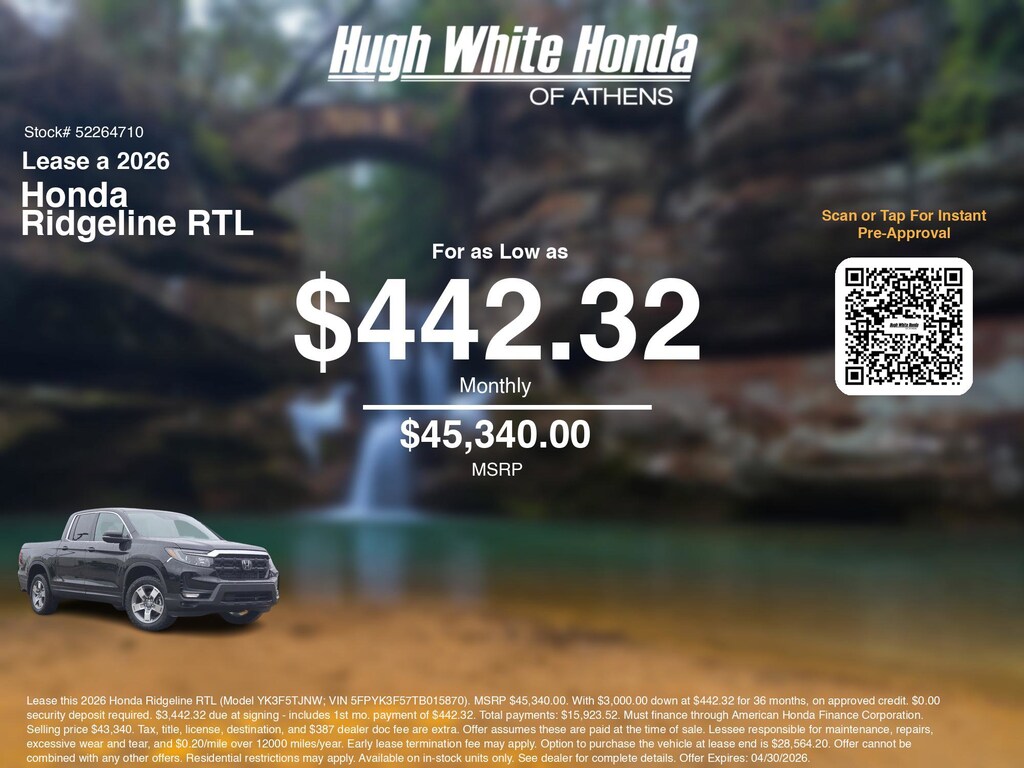 Disclaimer: Lease this 2026 Honda Ridgeline RTL (Model YK3F5TJNW; VIN 5FPYK3F57TB015870). MSRP $45,340.00. With $3,000.00 down at $442.32 for 36 months, on approved credit. $0.00 security deposit required. $3,442.32 due at signing - includes 1st mo. payment of $442.32. Total payments: $15,923.52. Must finance through American Honda Finance Corporation. Selling price $43,340. Tax, title, license, destination, and $387 dealer doc fee are extra. Offer assumes these are paid at the time of sale. Lessee responsible for maintenance, repairs, excessive wear and tear, and $0.20/mile over 12000 miles/year. Early lease termination fee may apply. Option to purchase the vehicle at lease end is $28,564.20. Offer cannot be combined with any other offers. Residential restrictions may apply. Available on in-stock units only. See dealer for complete details. Offer Expires: 04/30/2026.