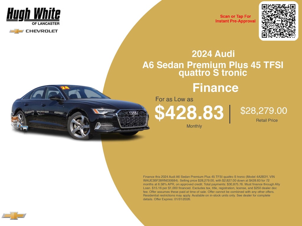 This and other GM finance offers leverage the benefits of GM Financial. Call or drive in for GM finance deals like this stunning 2024 Audi A6 Sedan with finance options near Lancaster! This A6 Sedan is also available for sale near Pickerington, Circleville, and Logan. These GM finance specials end 1/31/2026 Disclaimer: Finance this 2024 Audi A6 Sedan Premium Plus 45 TFSI quattro S tronic (Model 4A2B3Y, VIN WAUE3BF28RN030684). Selling price $28,279.00, with $2,827.00 down at $428.83 for 72 months at 6.58% APR, on approved credit. Total payments: $30,875.76. Must finance through Ally Loan. $15.16 per $1,000 financed. Excludes tax, title, registration, license, and $250 dealer doc fee. Offer assumes these paid at time of sale. Offer cannot be combined with any other offers. Residential restrictions may apply. Available on in-stock units only. See dealer for complete details. Offer Expires: 01/31/2026.