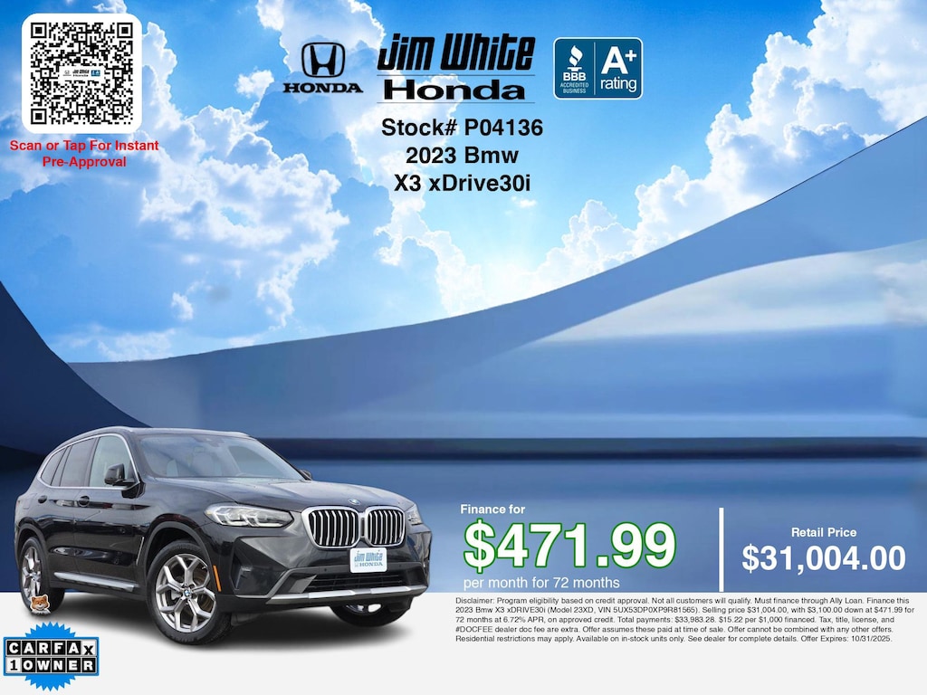 Disclaimer: Disclaimer: Program eligibility based on credit approval. Not all customers will qualify. Must finance through Ally Loan. Finance this 2023 Bmw X3 xDRIVE30i (Model 23XD, VIN 5UX53DP0XP9R81565). Selling price $31,004.00, with $3,100.00 down at $471.99 for 72 months at 6.72% APR, on approved credit. Total payments: $33,983.28. $15.22 per $1,000 financed. Tax, title, license, and #DOCFEE dealer doc fee are extra. Offer assumes these paid at time of sale. Offer cannot be combined with any other offers. Residential restrictions may apply. Available on in-stock units only. See dealer for complete details. Offer Expires: 10/31/2025.
