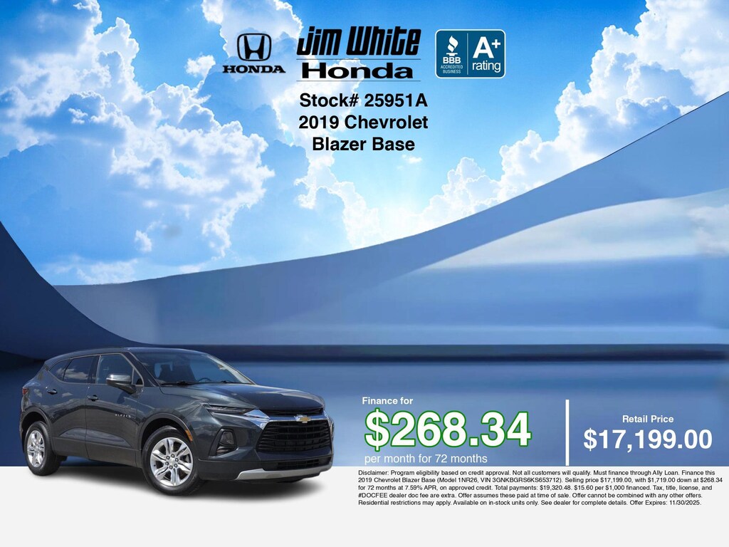 If you are ready to finance your used car near Maumee, Toledo, Perrysburg, and Waterville, Jim White Honda is thrilled to offer you a competitive finance offer on this 2019 Chevrolet Blazer Base.