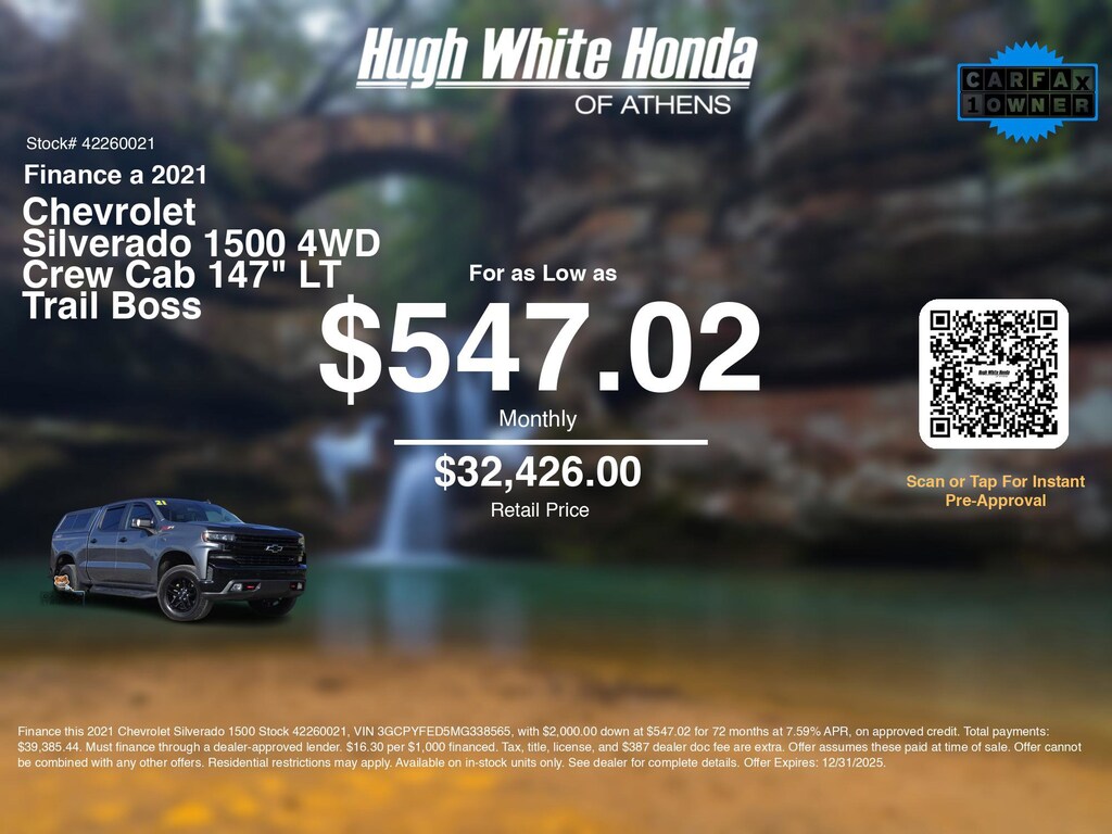 If you're ready to finance a quality used vehicle near Athens, Nelsonville, Logan, and Parkersburg, Hugh White Honda of Athens is thrilled to offer you a competitive finance offer on this 2021 Chevrolet Silverado 1500 4WD Crew Cab 147" LT Trail Boss. Use our car payment calculator to estimate your monthly payments or see how the monthly payment of $547.02 is calculated for well-qualified buyers shopping at Hugh White Honda of Athens with Tier 1 credit: