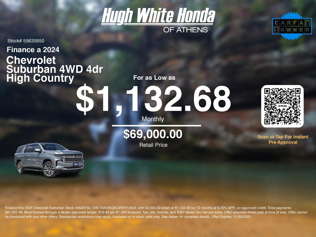 If you're ready to finance a quality used vehicle near Athens, Nelsonville, Logan, and Parkersburg, Hugh White Honda of Athens is thrilled to offer you a competitive finance offer on this 2024 Chevrolet Suburban 4WD 4dr High Country. Use our car payment calculator to estimate your monthly payments or see how the monthly payment of $1,132.68 is calculated for well-qualified buyers shopping at Hugh White Honda of Athens with Tier 1 credit: