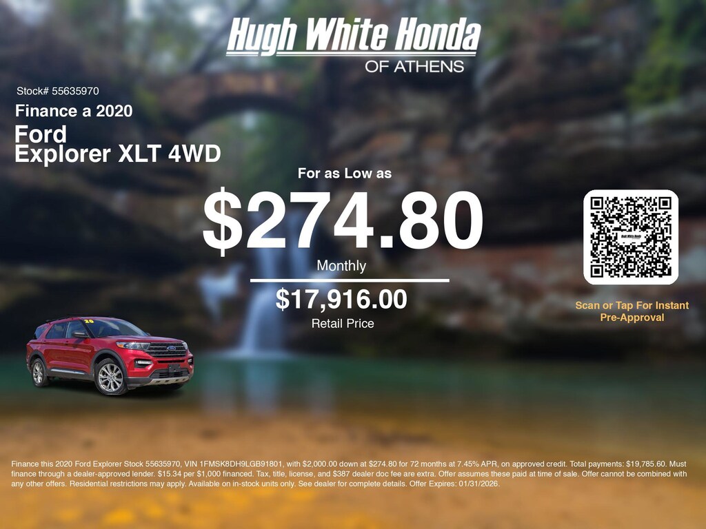 If you're ready to finance a quality used vehicle near Athens, Nelsonville, Logan, and Parkersburg, Hugh White Honda of Athens is thrilled to offer you a competitive finance offer on this 2020 Ford Explorer XLT 4WD. Use our car payment calculator to estimate your monthly payments or see how the monthly payment of $274.80 is calculated for well-qualified buyers shopping at Hugh White Honda of Athens with Tier 1 credit: