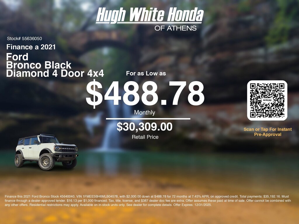 Our car loan payment calculator can help you calculate car payment options for this and other Honda finance offers that leverage the benefits of Honda Financial Services.@@ Call or drive in for Honda finance deals like this stunning 2021 Ford Bronco with finance options near Athens!  Use our car monthly payment calculator to estimate your car payment, or try our car payment estimator to explore different loan terms. These Honda finance specials end 12/31/2025.