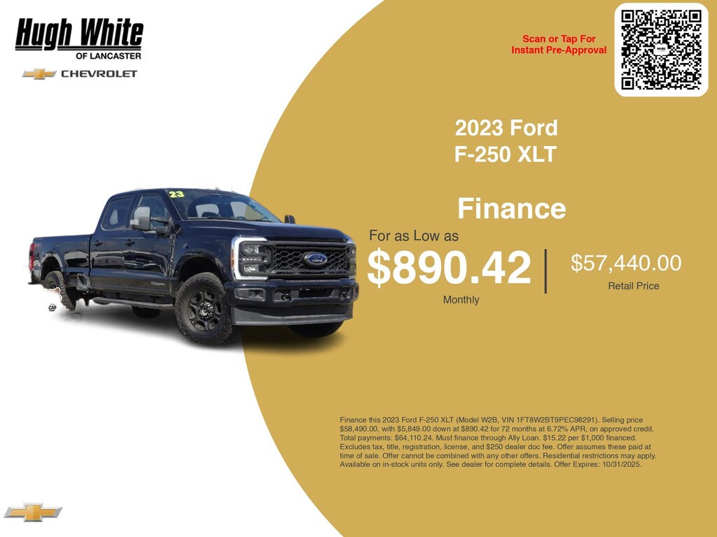 This and other GM finance offers leverage the benefits of GM Financial. Call or drive in for GM finance deals like this stunning 2023 Ford F-250 with finance options near Lancaster! This F-250 is also available for sale near Pickerington, Circleville, and Logan. These GM finance specials end 10/31/2025 Disclaimer: Finance this 2023 Ford F-250 XLT (Model W2B, VIN 1FT8W2BT9PEC98291). Selling price $58,490.00, with $5,849.00 down at $890.42 for 72 months at 6.72% APR, on approved credit. Total payments: $64,110.24. Must finance through Ally Loan. $15.22 per $1,000 financed. Excludes tax, title, registration, license, and $250 dealer doc fee. Offer assumes these paid at time of sale. Offer cannot be combined with any other offers. Residential restrictions may apply. Available on in-stock units only. See dealer for complete details. Offer Expires: 10/31/2025.