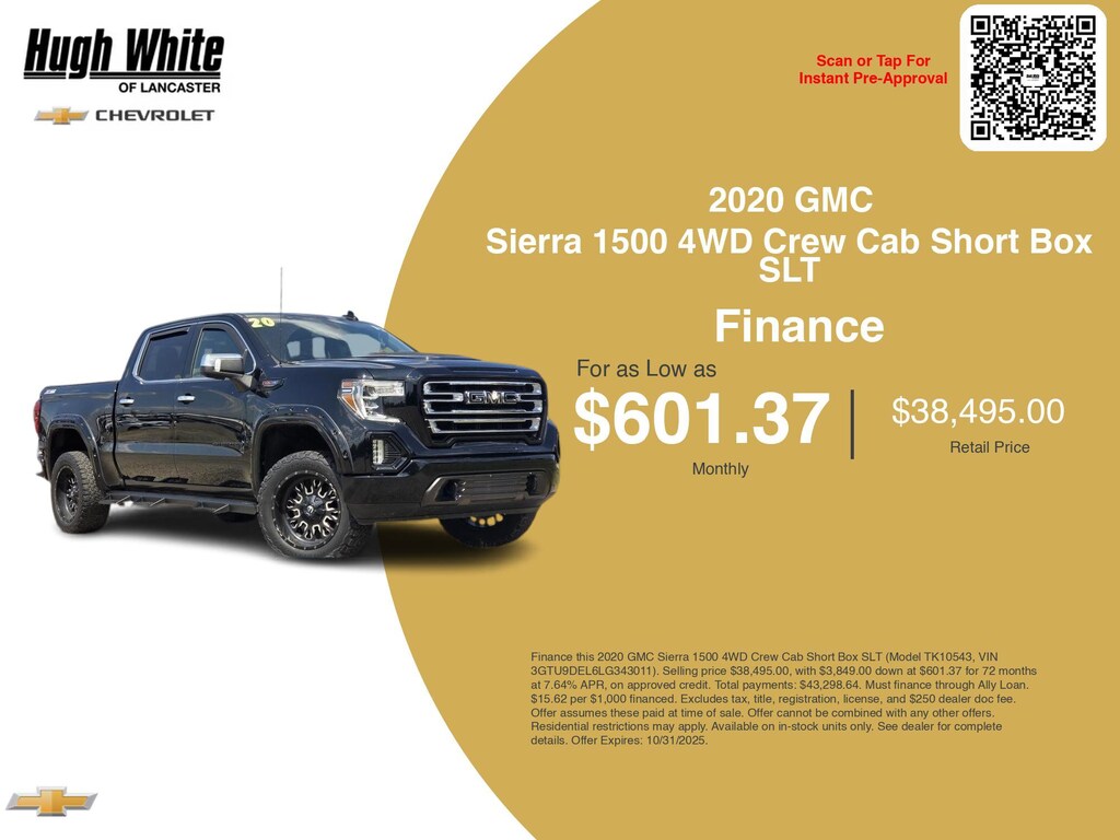 This and other GM finance offers leverage the benefits of GM Financial. Call or drive in for GM finance deals like this stunning 2020 GMC Sierra 1500 with finance options near Lancaster! This Sierra 1500 is also available for sale near Pickerington, Circleville, and Logan. These GM finance specials end 10/31/2025 Disclaimer: Finance this 2020 GMC Sierra 1500 4WD Crew Cab Short Box SLT (Model TK10543, VIN 3GTU9DEL6LG343011). Selling price $38,495.00, with $3,849.00 down at $601.37 for 72 months at 7.64% APR, on approved credit. Total payments: $43,298.64. Must finance through Ally Loan. $15.62 per $1,000 financed. Excludes tax, title, registration, license, and $250 dealer doc fee. Offer assumes these paid at time of sale. Offer cannot be combined with any other offers. Residential restrictions may apply. Available on in-stock units only. See dealer for complete details. Offer Expires: 10/31/2025.