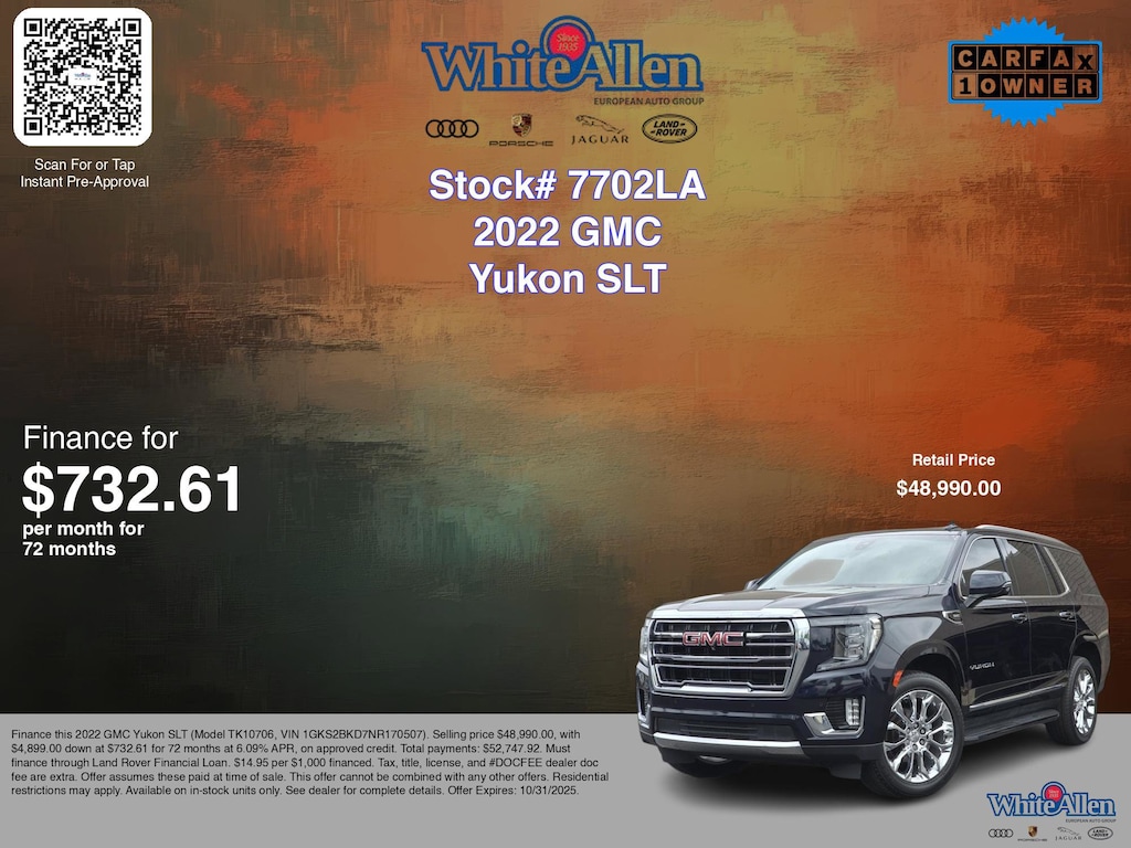 Disclaimer: Finance this 2022 GMC Yukon SLT (Model TK10706, VIN 1GKS2BKD7NR170507). Selling price $48,990.00, with $4,899.00 down at $732.61 for 72 months at 6.09% APR, on approved credit. Total payments: $52,747.92. Must finance through Land Rover Financial Loan. $14.95 per $1,000 financed. Tax, title, license, and #DOCFEE dealer doc fee are extra. Offer assumes these paid at time of sale. This offer cannot be combined with any other offers. Residential restrictions may apply. Available on in-stock units only. See dealer for complete details. Offer Expires: 10/31/2025.