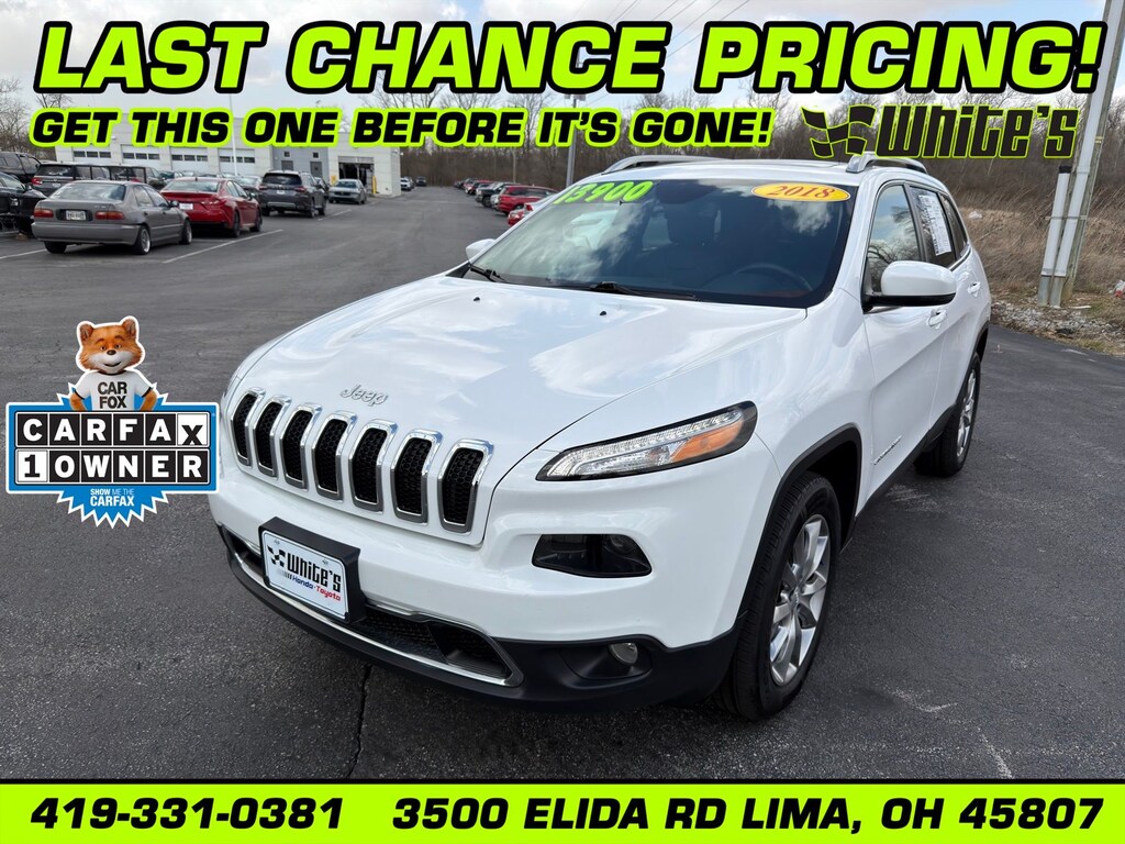 White's Honda/Toyota of Lima is pleased to offer this 2018 Jeep Cherokee in Bright White Clearcoat with Black Leather. This Cherokee is very well equipped with One Owner! And Local Trade!Quick Order Package 26G, 1 Year Trial (Registration Required), 4-Wheel Disc Brakes, 5-Year SiriusXM Traffic Service, 5-Year SiriusXM Travel Link Service, 6 Speakers, 8.4" Touchscreen Display, ABS brakes, Anti-whiplash front head restraints, Automatic temperature control, Auxiliary Transmission Oil Cooler, Brake assist, Delay-off headlights, Dual front impact airbags, Dual front side impact airbags, Electronic Stability Control, Emergency communication system: Uconnect Access, Four wheel independent suspension, Front anti-roll bar, Front Bucket Seats, Front Center Armrest, Front dual zone A/C, Front fog lights, Fully automatic headlights, GPS Antenna Input, GPS Navigation, HD Radio, Heated front seats, High intensity discharge headlights: Bi-Xenon, Integrated Voice Command w/Bluetooth, Knee airbag, Leather Trimmed Bucket Seats, Low tire pressure warning, Normal Duty Suspension, Occupant sensing airbag, Overhead airbag, Panic alarm, ParkView Rear Back-Up Camera, Power driver seat, Power Front/Fixed Rear Full Sunroof, Power Liftgate, Radio: Uconnect 3C Nav w/8.4" Display, Radio: Uconnect 3C w/8.4" Display, Rear anti-roll bar, Rear side impact airbag, Security system, SiriusXM Satellite Radio, SiriusXM Traffic, SiriusXM Travel Link, Speed-sensing steering, Split folding rear seat, Traction control, and Uconnect Access.