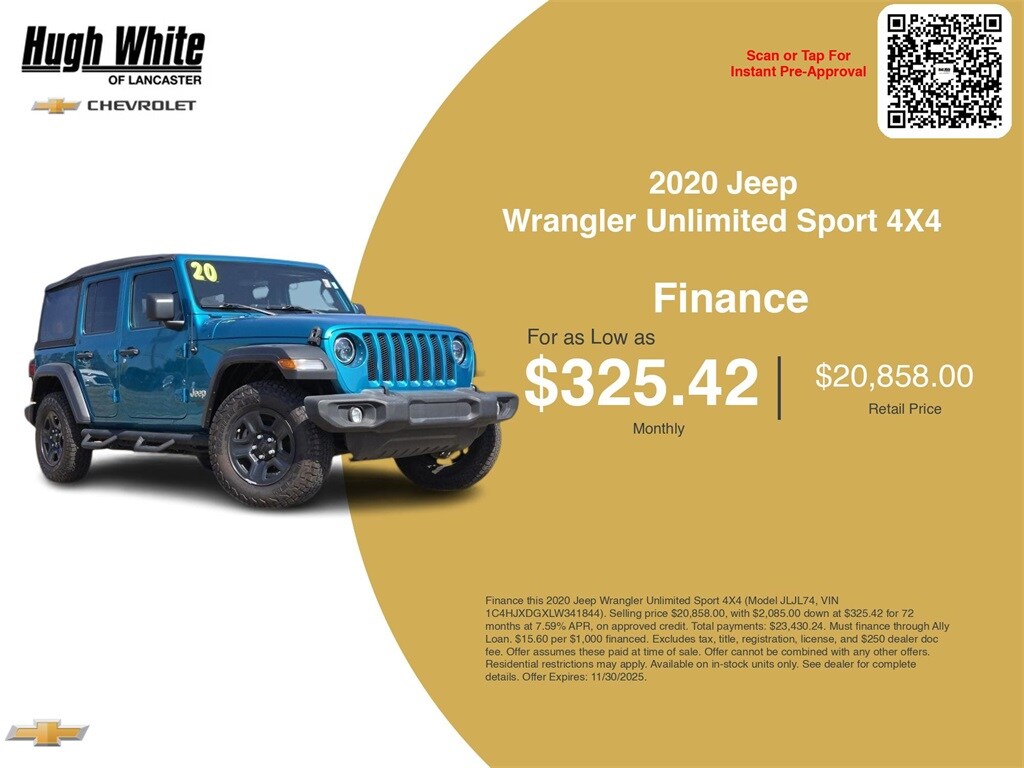 This and other GM finance offers leverage the benefits of GM Financial. Call or drive in for GM finance deals like this stunning 2020 Jeep Wrangler Unlimited with finance options near Lancaster! This Wrangler Unlimited is also available for sale near Pickerington, Circleville, and Logan. These GM finance specials end 11/30/2025 Disclaimer: Finance this 2020 Jeep Wrangler Unlimited Sport 4X4 (Model JLJL74, VIN 1C4HJXDGXLW341844). Selling price $20,858.00, with $2,085.00 down at $325.42 for 72 months at 7.59% APR, on approved credit. Total payments: $23,430.24. Must finance through Ally Loan. $15.60 per $1,000 financed. Excludes tax, title, registration, license, and $250 dealer doc fee. Offer assumes these paid at time of sale. Offer cannot be combined with any other offers. Residential restrictions may apply. Available on in-stock units only. See dealer for complete details. Offer Expires: 11/30/2025.