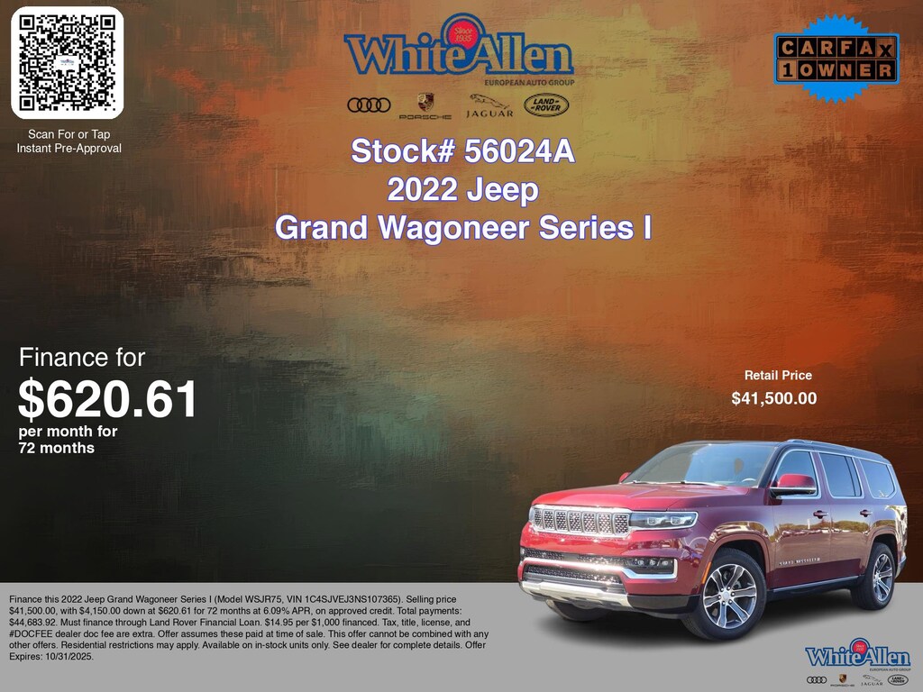 Disclaimer: Finance this 2022 Jeep Grand Wagoneer Series I (Model WSJR75, VIN 1C4SJVEJ3NS107365). Selling price $41,500.00, with $4,150.00 down at $620.61 for 72 months at 6.09% APR, on approved credit. Total payments: $44,683.92. Must finance through Land Rover Financial Loan. $14.95 per $1,000 financed. Tax, title, license, and #DOCFEE dealer doc fee are extra. Offer assumes these paid at time of sale. This offer cannot be combined with any other offers. Residential restrictions may apply. Available on in-stock units only. See dealer for complete details. Offer Expires: 10/31/2025.