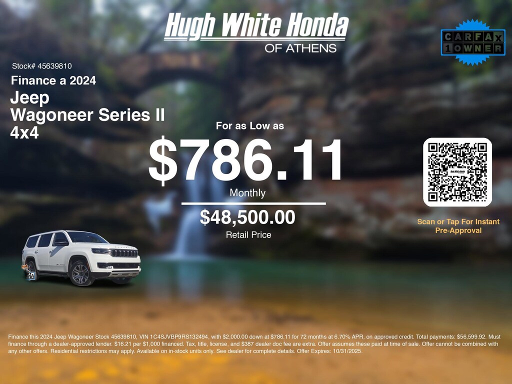 Our car loan payment calculator can help you calculate car payment options for this and other Honda finance offers that leverage the benefits of Honda Financial Services.@@ Call or drive in for Honda finance deals like this stunning 2024 Jeep Wagoneer with finance options near Athens! Use our car monthly payment calculator to estimate your car payment, or try our car payment estimator to explore different loan terms. These Honda finance specials end 10/31/2025.