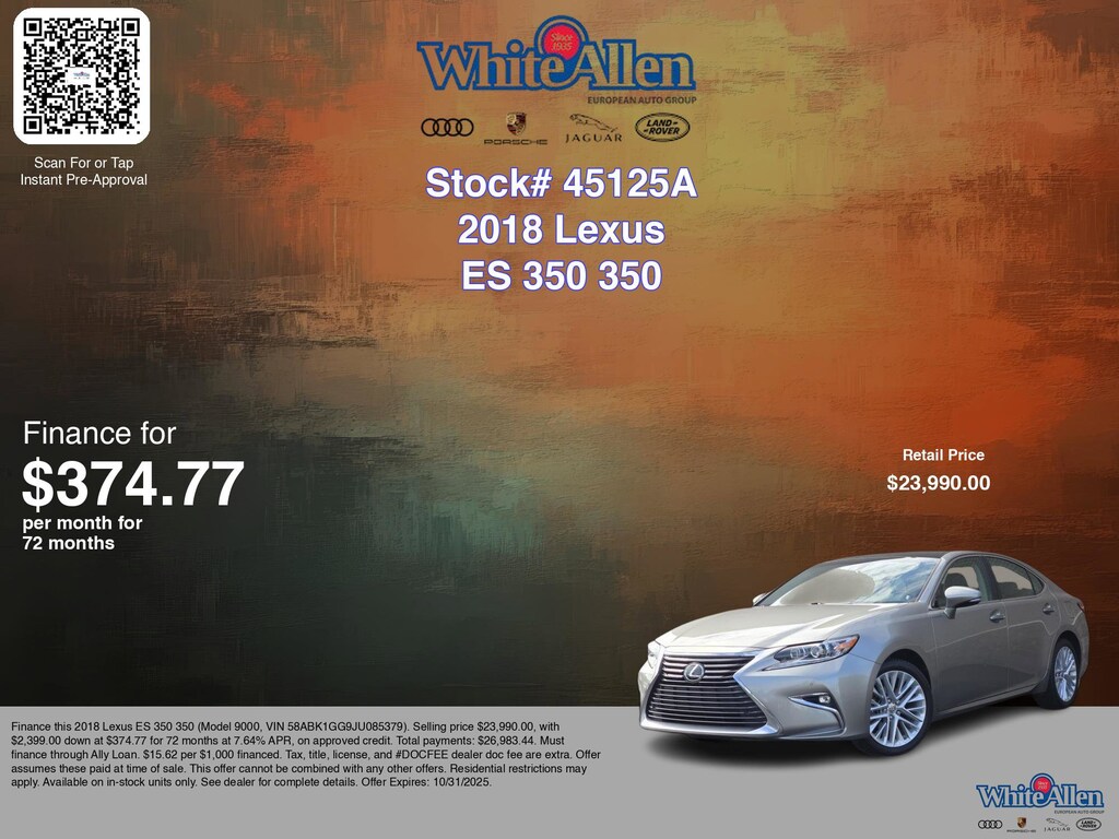 Disclaimer: Finance this 2018 Lexus ES 350 350 (Model 9000, VIN 58ABK1GG9JU085379). Selling price $23,990.00, with $2,399.00 down at $374.77 for 72 months at 7.64% APR, on approved credit. Total payments: $26,983.44. Must finance through Ally Loan. $15.62 per $1,000 financed. Tax, title, license, and #DOCFEE dealer doc fee are extra. Offer assumes these paid at time of sale. This offer cannot be combined with any other offers. Residential restrictions may apply. Available on in-stock units only. See dealer for complete details. Offer Expires: 10/31/2025.