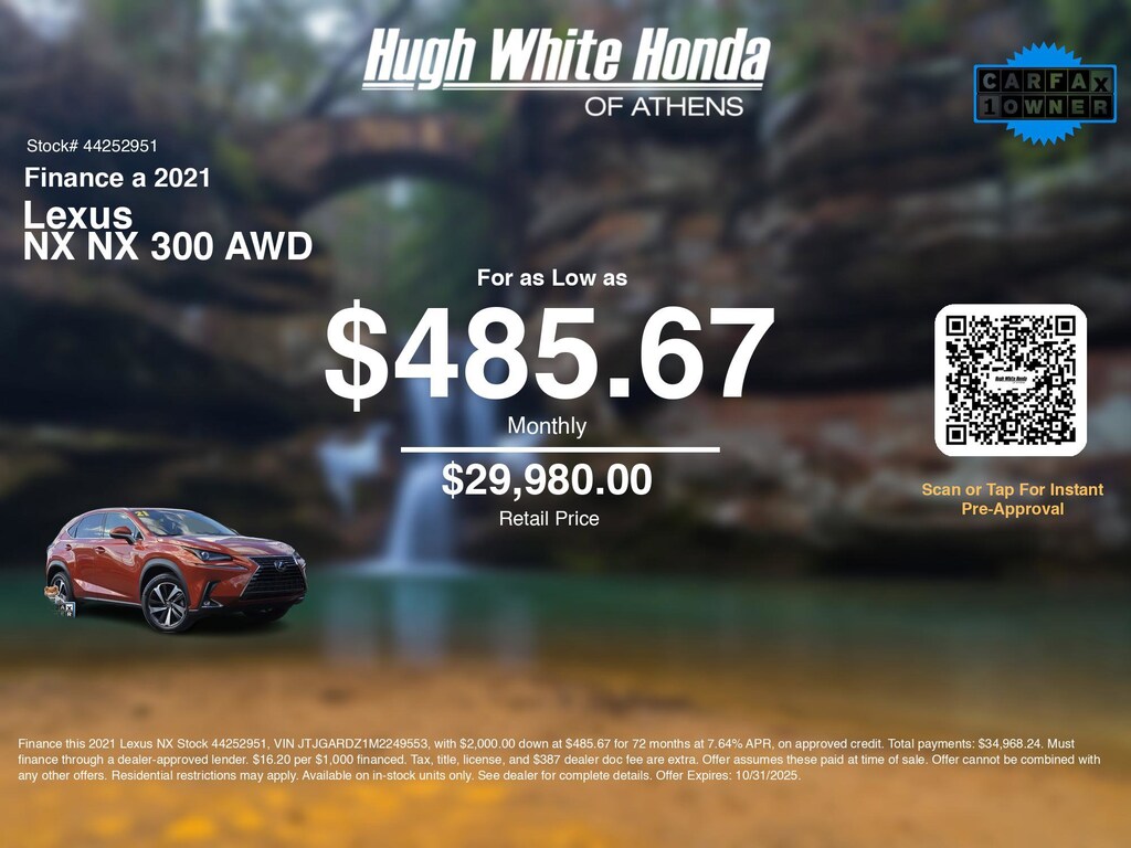 If you're ready to finance a quality used vehicle near Athens, Nelsonville, Logan, and Parkersburg, Hugh White Honda of Athens is thrilled to offer you a competitive finance offer on this 2021 Lexus NX NX 300 AWD. Use our car payment calculator to estimate your monthly payments or see how the monthly payment of $485.67 is calculated for well-qualified buyers shopping at Hugh White Honda of Athens with Tier 1 credit: