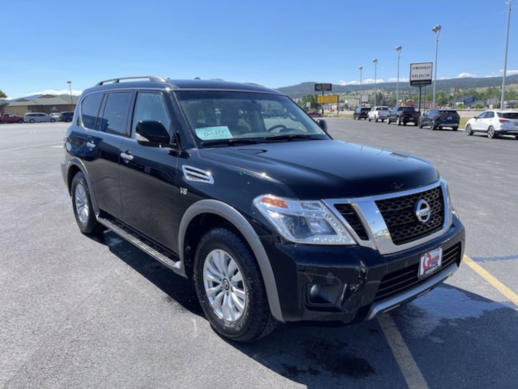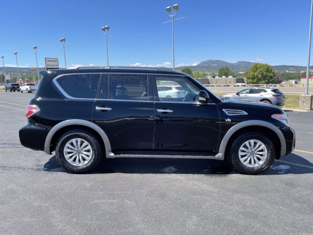 Boasts 18 Highway MPG and 13 City MPG! This Nissan Armada delivers a Regular Unleaded V-8 5.6 L/339 engine powering this Automatic transmission. SUPER BLACK, BLACK, CLOTH SEAT TRIM, [L92] 3RD ROW CARPETED FLOOR MATS - BENCH SEAT -inc: carpeted cargo mat. This Nissan Armada Features the Following Options [K01] DRIVER PACKAGE -inc: Auto-Dimming Interior Rear View Mirror, universal garage door opener, Power Lift Gate, Trailer Towing Harness, pre-wire and connector for brake controller, Power 60/40 3rd Row Seat, Front Fog Lights , Window Grid Diversity Antenna, Wheels: 18' Alloy, Wheels w/Silver Accents, Valet Function, Trunk/Hatch Auto-Latch, Trip Computer, Transmission: 7-Speed Automatic -inc: manual mode and synchronized rev control, Transmission w/Driver Selectable Mode and Oil Cooler, Tires: P265/70R18 All-Season. Visit Us Today Stop by White's Queen City Motors located at 1900 North Ave, Spearfish, SD 57783 for a quick visit and a great vehicle!