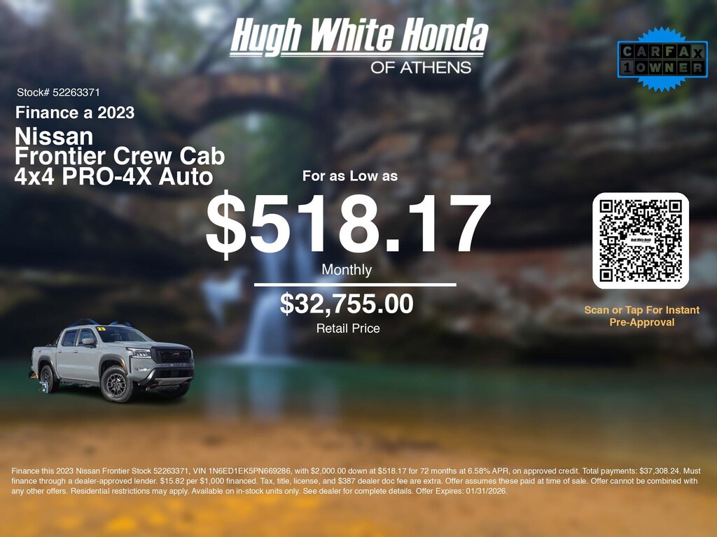 Our car loan payment calculator can help you calculate car payment options for this and other Honda finance offers that leverage the benefits of Honda Financial Services.@@ Call or drive in for Honda finance deals like this stunning 2023 Nissan Frontier with finance options near Athens!  Use our car monthly payment calculator to estimate your car payment, or try our car payment estimator to explore different loan terms. These Honda finance specials end 1/31/2026.