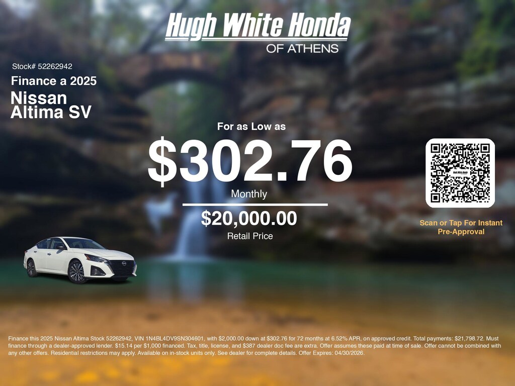 If you're ready to finance a quality used vehicle near Athens, Nelsonville, Logan, and Parkersburg, Hugh White Honda of Athens is thrilled to offer you a competitive finance offer on this 2025 Nissan Altima SV. Use our car payment calculator to estimate your monthly payments or see how the monthly payment of $302.76 is calculated for well-qualified buyers shopping at Hugh White Honda of Athens with Tier 1 credit: