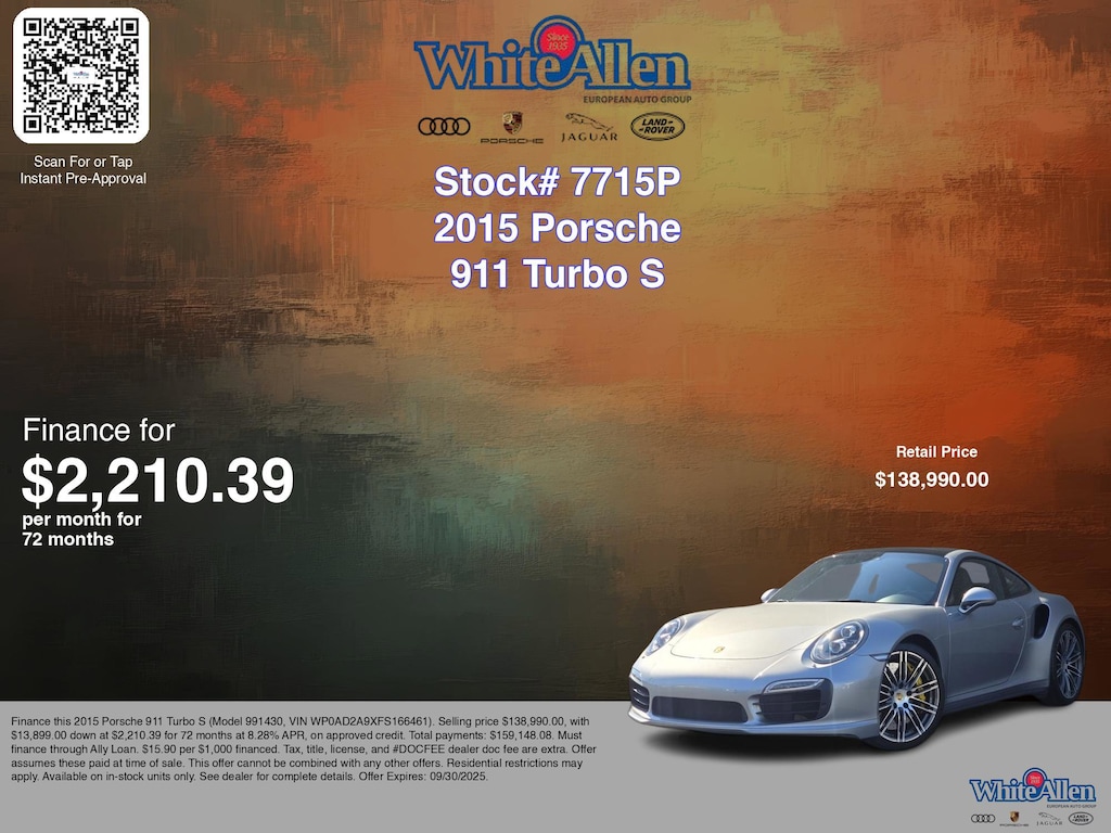 Disclaimer: Finance this 2015 Porsche 911 Turbo S (Model 991430, VIN WP0AD2A9XFS166461). Selling price $138,990.00, with $13,899.00 down at $2,210.39 for 72 months at 8.28% APR, on approved credit. Total payments: $159,148.08. Must finance through Ally Loan. $15.90 per $1,000 financed. Tax, title, license, and #DOCFEE dealer doc fee are extra. Offer assumes these paid at time of sale. This offer cannot be combined with any other offers. Residential restrictions may apply. Available on in-stock units only. See dealer for complete details. Offer Expires: 09/30/2025.