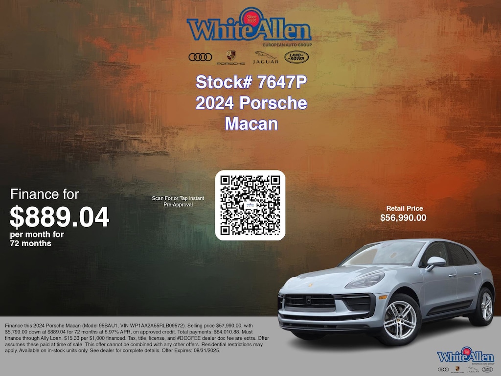 Disclaimer: Finance this 2024 Porsche Macan (Model 95BAU1, VIN WP1AA2A55RLB09572). Selling price $57,990.00, with $5,799.00 down at $889.04 for 72 months at 6.97% APR, on approved credit. Total payments: $64,010.88. Must finance through Ally Loan. $15.33 per $1,000 financed. Tax, title, license, and #DOCFEE dealer doc fee are extra. Offer assumes these paid at time of sale. This offer cannot be combined with any other offers. Residential restrictions may apply. Available on in-stock units only. See dealer for complete details. Offer Expires: 08/31/2025.