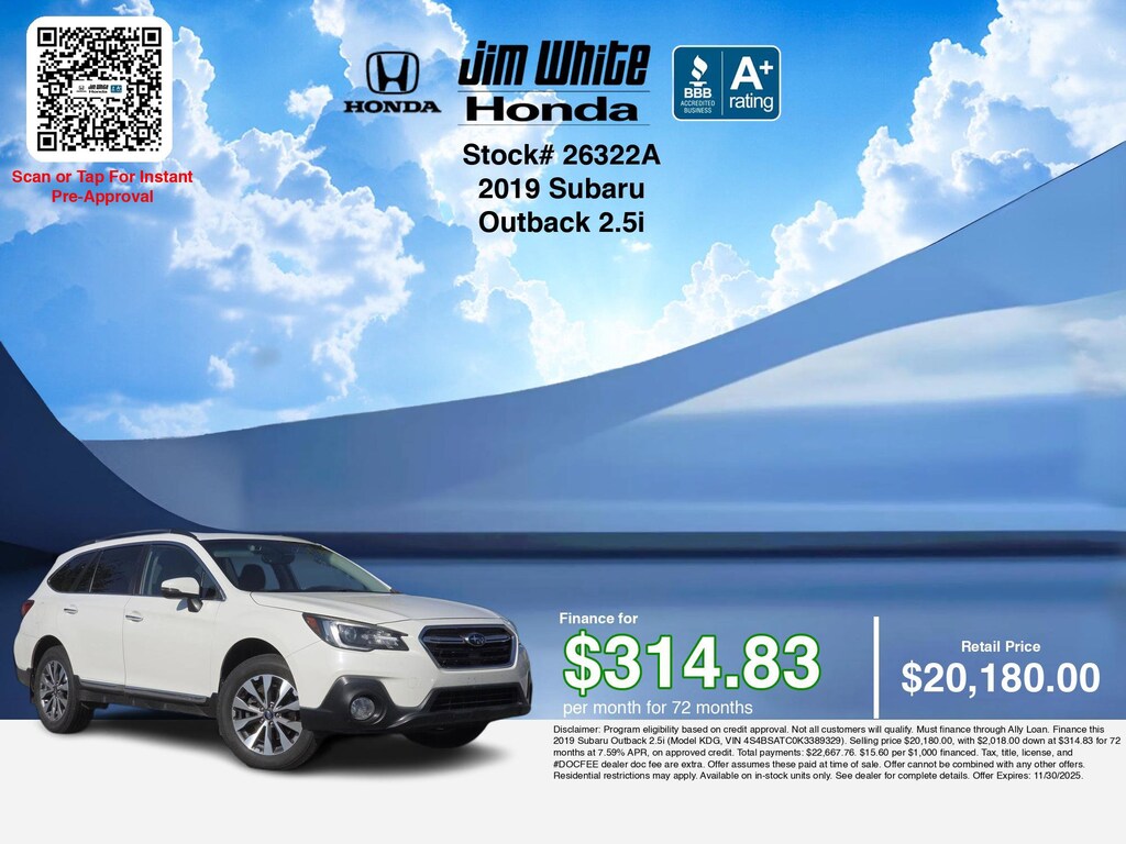 Disclaimer: Disclaimer: Program eligibility based on credit approval. Not all customers will qualify. Must finance through Ally Loan. Finance this 2019 Subaru Outback 2.5i (Model KDG, VIN 4S4BSATC0K3389329). Selling price $20,180.00, with $2,018.00 down at $314.83 for 72 months at 7.59% APR, on approved credit. Total payments: $22,667.76. $15.60 per $1,000 financed. Tax, title, license, and #DOCFEE dealer doc fee are extra. Offer assumes these paid at time of sale. Offer cannot be combined with any other offers. Residential restrictions may apply. Available on in-stock units only. See dealer for complete details. Offer Expires: 11/30/2025.